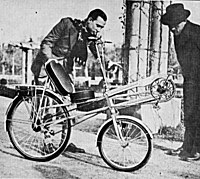 Among recumbent enthusiasts the Velocar marks the beginning of the recumbent era, as Manuel Morand participated bicycle races and then Francis Faure 1933 rode a new