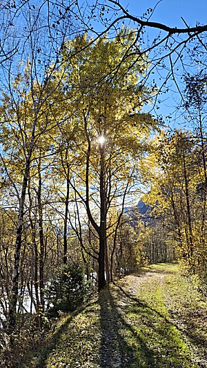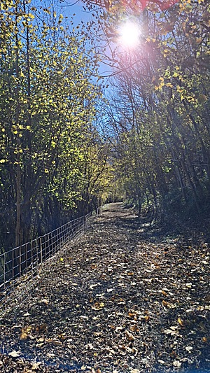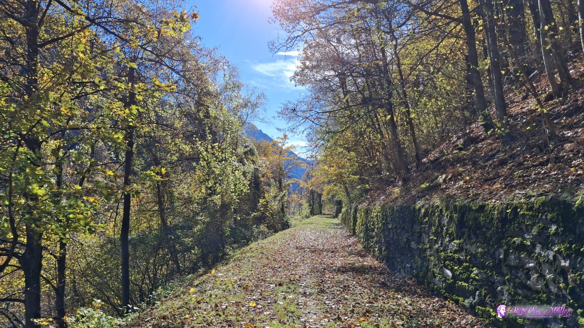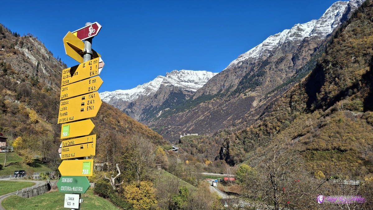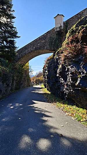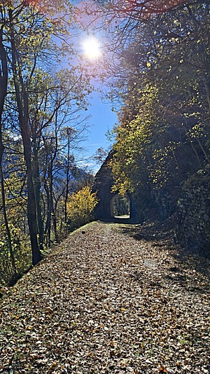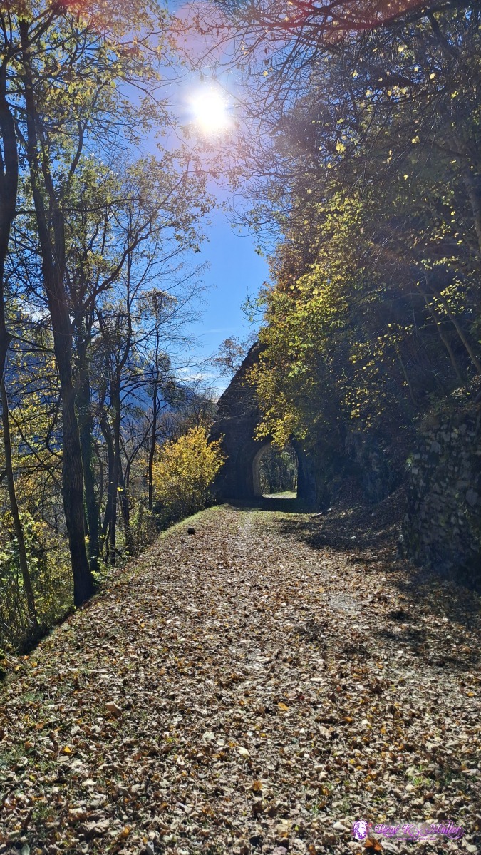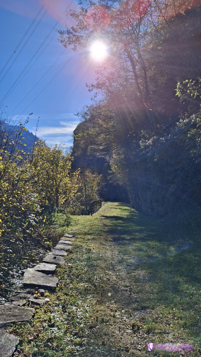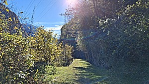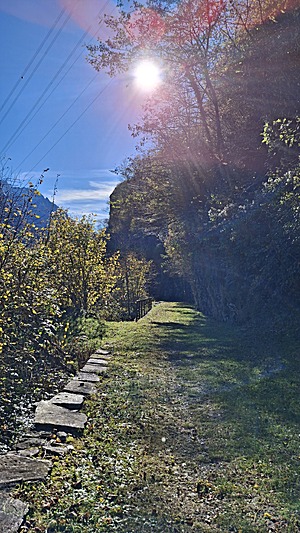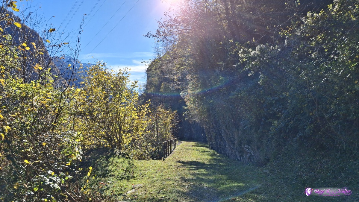 Late arrival in Mesocco at ~12:15, and along former train tracks the hiking trail smoothly descends from 800m to 450m, warm wind from the south (and north changing).